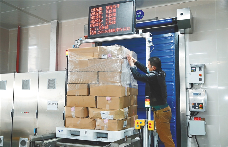 4月28日,在位于海南老城经济开发区的海南翔泰渔业股份有限公司(以下简称翔泰公司)自动化冷链物流仓库内,电子屏幕实时显示货物状态,一箱箱罗非鱼、金鲳鱼水产品经传送带运至冷库指定货架,完成上架。