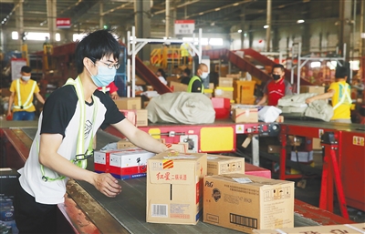 另一边,在位于澄迈县的京东物流华南中心海南园区内,现代化的流水线高效运转,工人们娴熟地分拣包裹,通过高效、专业的物流服务,让包裹及时送到买家手中。