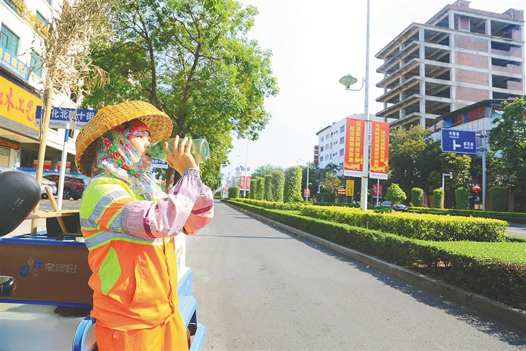 炎炎夏日,儋州市环卫工人坚守岗位,用汗水为城市营造良好环境。图为环卫工人饮水解渴。通讯员 羊文彪 摄