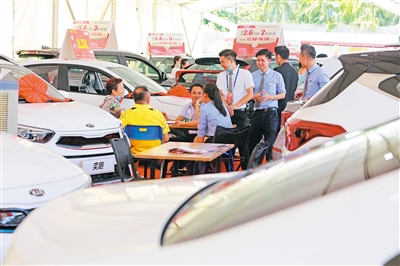 活动期间正逢高温天气,依然挡不住市民前来看车的热情。5月10日下午,那大突然乌云密布,但仍有不少市民前来看车,各个车行的销售代表卖力地介绍自家的新车。