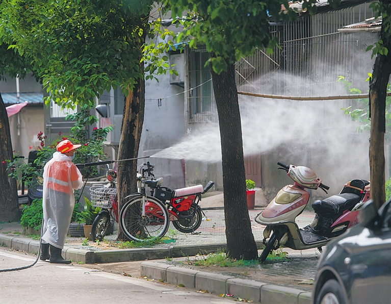 5月11日,工作人员在武汉市东西湖区长青街三民小区进行消杀作业。