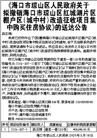 《海口市琼山区人民政府关于拟撤销海口市琼山区红城湖片区棚户区(城中村)改造征收项目集中购买住房协议》的送达公告