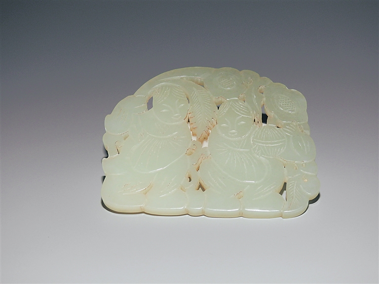另一件透雕的“和合二仙”玉牌饰,用的是新疆和田白玉,质地洁白无瑕,珍贵无比。该牌饰高6厘米,宽8厘米,体量较大。两童披发,一童捧着紧闭的盒子,没有蝙蝠飞出;另一童持荷,其荷硕大无比,两童在荷下游玩,神态憨状可掬。这块牌饰,由于用料大,和田白玉又极其珍贵,上述因素决定了雕刻工艺不能马虎,必须上乘。透雕工艺非常复杂,在加工工具较为落后的年代,要把一块玉雕刻成精品,是劳心劳力的事。这块牌饰通身布满了玻璃光,莹光满满,工匠想必花费了很多精力,用简陋的工具在牌饰表面抛光打磨,方达到此种效果,让人不忍释手。