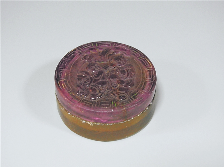 我藏有的清代玛瑙圆形小盒,直径5.5厘米,高2.5厘米,质地为水晶中的紫晶,呈淡淡的粉红色。小盒由上下两部分组成,两块整料雕琢而成。在盒盖一块邮票大小面积上,凸雕出“和合二仙”的图案,整体布局紧凑,雕刻工艺精巧,造型动感十足,栩栩如生。二仙发扎双髻,一童捧盒,飞出双蝠;另一童持荷。这小盒的原主人是一个书画爱好者,一天我到他工作室去玩,一眼就看上了这小盒,里面的印泥早已干涸,看来是很久没使用了。我软磨硬泡,拿了两刀上好红星宣纸,才将其收入囊中。回家后清理干净,才发现盒盖是紫晶,盒身是白水晶,紫白相衬,流光溢彩,不可多见。
