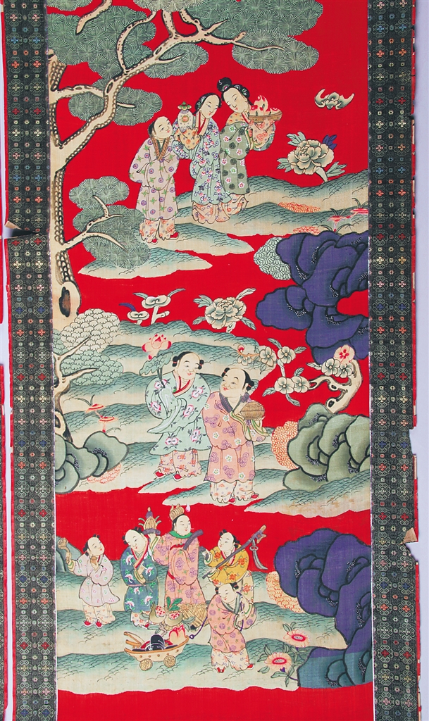 我省民族博物馆收藏着明代缂丝“群仙祝寿图”一对,是上世纪80年代乐嗣炳先生捐献的。缂丝,是我国传统丝绸艺术品中的精华,宋元以来一直是皇家御用织物之一。因其工艺繁复,完成一件缂丝作品,需用数月或一年以上时间,因而,存世精品极为稀少,民间有“一寸缂丝一寸金” 的说法。这件“群仙祝寿图”作品除装裱部分稍残外,画芯保存完好,且尺幅宽大。上面分别有福禄寿三星、王母娘娘、八仙、麻姑等神仙图案,“和合二仙”也赫然在列,可见其重要性。
