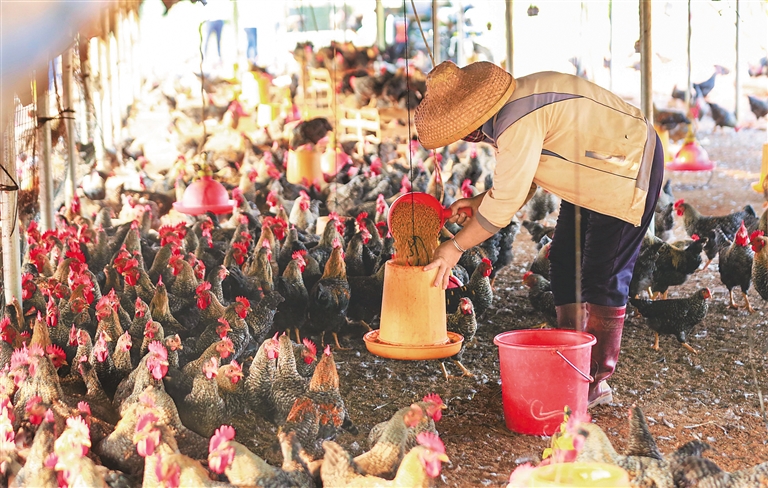 近日,在儋州市大成镇绿元素儋州鸡养殖基地,工人正在喂鸡。该基地目前存栏近两万只鸡,为周边村庄20多名贫困劳动力提供就业岗位。下一步,该基地将扩大规模,打造“儋州鸡”品牌,引导周边村民参与养殖,带动村民走上致富路。本报记者 陈元才 摄