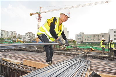 日前,位于海口市永万路的海南现代妇幼医院项目工地,骄阳如火,暑气炙人,180多名工人挥汗如雨加紧建设。项目施工方中天建设现场负责人介绍,目前基础部分已完成60%,累计投资达1.1亿元。为了完成原定工作计划,工人们加班加点抢工期,每天最早凌晨5点就开始干活,最晚夜里10点才停工。本报记者 王凯 摄
