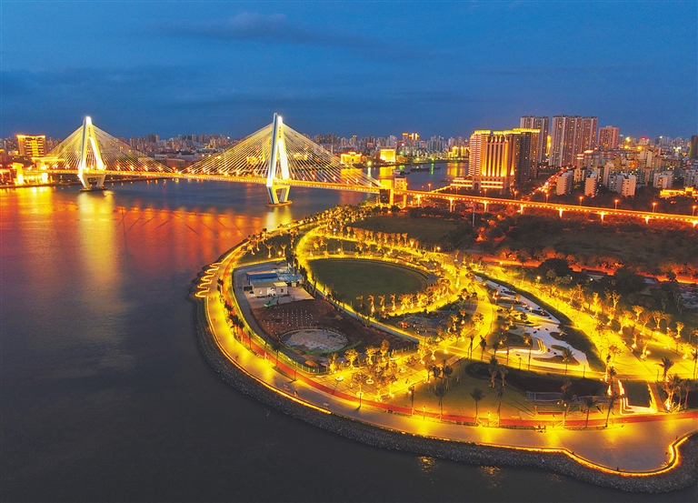 5月17日,俯瞰海口湾世纪公园夜景。近年来,海口市着力提升城市公共区域亮化水平,一方面方便了市民游客夜间出行,激活了夜经济,另一方面展示了夜海口的独特魅力,提升了城市的整体形象。本报记者 封烁 摄
