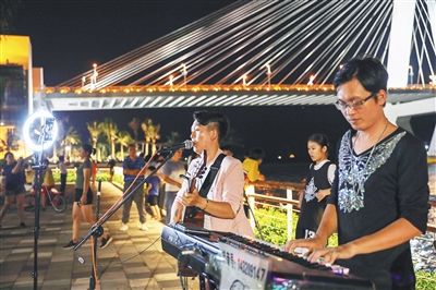 如今,越来越多的歌手在海口湾驻足,或是浅吟低唱柔情缱绻,或是引吭高歌唱到忘情。围观的人,有的席地而坐,开启手机的手电筒,陶醉地随着节奏挥舞着,享受这拥有着美妙旋律的滨海之夜。