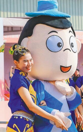 儋州调声演员和卡通人物合影。