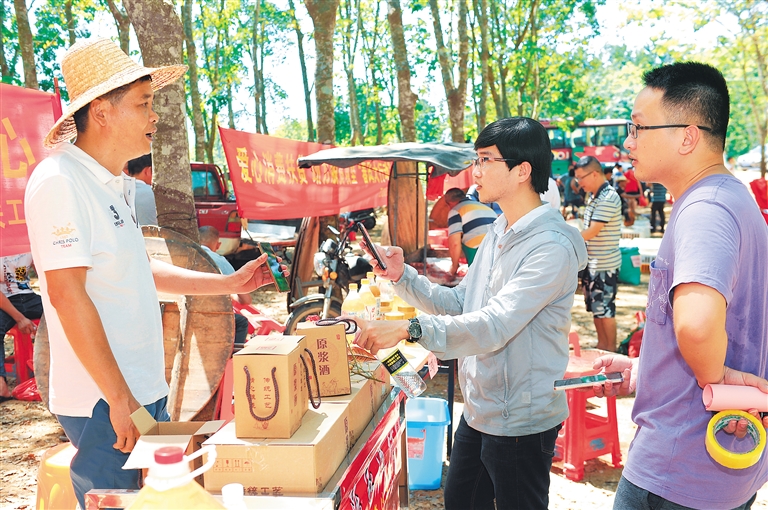 在澄迈县大丰镇举办的消费扶贫活动现场,党员们凭借着大丰镇党委统一发放的“党员奖励积分券”,在扶贫集市上向贫困户兑换荔枝、苦瓜、鸡、蜂蜜等农产品。大丰镇各社区也发动群众参与进来。