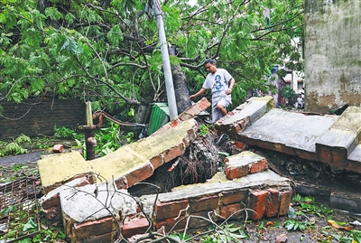 据《印度时报》21日报道,特强气旋风暴“安攀”20日下午在印度东部西孟加拉邦沿海登陆后,目前已造成至少77人死亡。图为在印度西孟加拉邦首府加尔各答,一名男子在风暴后经过倒塌的围墙。新华社/路透