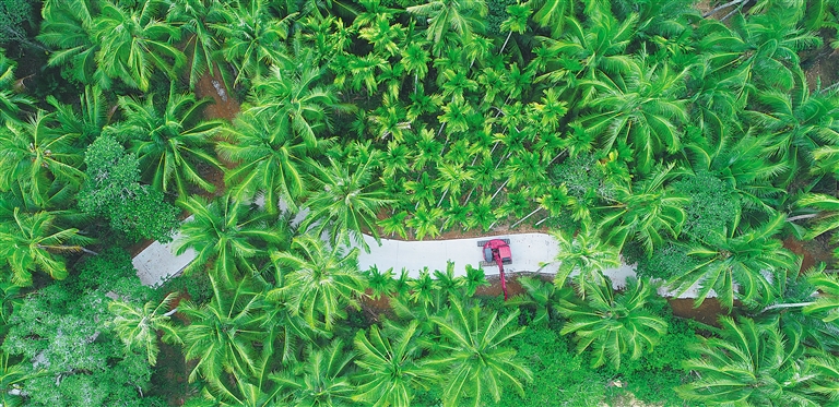 5月19日,文昌重兴镇群先村排田村民小组茂密的椰林下,挖掘机正在进行农村公路窄路面拓宽工程的土地平整。
