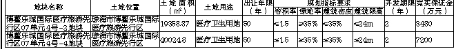 根据琼海市人民政府《关于博鳌乐城国际医疗旅游先行区07单元4号-2地块具备净地出让条件的证明》和《关于博鳌乐城国际医疗旅游先行区07单元4号-4地块具备净地出让条件的证明》,说明上述宗地土地权利清晰、安置补偿落实到位、地上附着物清表、无法律经济纠纷、土地开发利用规划条件明确、符合土壤环境质量要求、具备动工开发所必需条件。按照《关于印发<海南省建设用地出让控制标准(试行)>的通知》(琼国土资规〔2018〕7号)有关规定,07单元4号-2地块的投资强度不低于420万元/亩,年度产值不低于525万元/亩,年度税收不低于24.5万元/亩;07单元4号-4地块的投资强度不低于420万元/亩,年度产值不低于525万元/亩,年度税收不低于24.5万元/亩。以上控制指标按规定列入《产业项目发展和用地准入协议》,属于协议内容的组成部分,项目约定达产时间为签订《国有建设用地使用权出让合同》后的3年内。上述地块地上建筑须按照装配式建筑有关规定执行。二、中华人民共和国境内外的自然人、法人和其他组织均可申请参加(除法律法规另有规定外),仅限单独申请,不接受联合申请(注:失信被执行人不得参加本次竞买)。非琼海市注册的法人和其他组织的竞买人,在竞得土地后,需由竞得人在琼海市新成立的全资子公司在签订《挂牌成交确认书》之日起5日内与海南博鳌乐城国际医疗旅游先行区管理局签订《产业项目发展和用地准入协议》,在签订《产业项目发展和用地准入协议》后与琼海市自然资源和规划局签订《国有建设用地使用权出让合同》,并严格按照《产业项目发展和用地准入协议》和《国有建设用地使用权出让合同》约定内容进行开发建设。三、本次国有建设用地使用权挂牌出让设有底价,按报价最高且不低于底价的原则确定竞得人。四、申请人可于2020年6月10日至2020年6月26日到琼海市土地储备整理交易中心(或海南省公共资源交易服务中心一楼受理大厅3号窗口)查询和获取挂牌出让文件。五、申请人可于2020年6月10日至2020年6月26日到琼海市土地储备整理交易中心提交书面申请(或海南省公共资源交易服务中心一楼受理大厅3号窗口)。交纳竞买保证金的到账截止时间为2020年6月26日下午17时。经审查,申请人按规定交纳竞买保证金,具备申请条件的,我局将在2020年6月27日下午17时前确认其竞买资格。六、本次国有建设用地使用权挂牌出让地点:海南省政府会展楼二楼省公共资源交易服务中心土地交易厅,挂牌时间为:1.起始时间:2020年6月17日上午9时整。2.截止时间:2020年6月28日下午16时整。七、其他需要公告的事项1.本次挂牌出让实施机构为琼海市土地储备整理交易中心,详细情况请登录:http://www.landchina.com、http://zw.hainan.gov.cn/ggzy/、http://Ir.hainan.gov.cn/。本次挂牌事项如有变更,将在以上网站公告,届时以变更公告为准。2.本次挂牌出让竞买报价只接受书面报价,不接受电话、电子邮件、口头等方式报价,节假日正常受理报名、报价。八、联系方式,联系地址:琼海市金海路233号,联系电话:0898-62811911、65303602,联系人:蔡先生、李先生;九、本公告未尽事宜,详见挂牌出让文件,该文件所载内容为本公告的组成部分。
