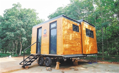 6月8日,在儋州市那大镇,海南农垦宝橡林产集团股份有限公司(以下简称宝橡林产集团)下属企业海南农垦宝联林产有限公司(以下简称宝联公司)的办公空地内,停放着两座玲珑小巧的移动木屋。