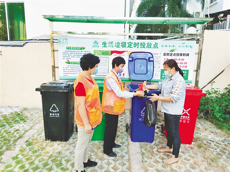③儋州市分类生活垃圾定时投放点,2名志愿劝导员引导市民正确分类垃圾。通讯员 罗鑫 摄