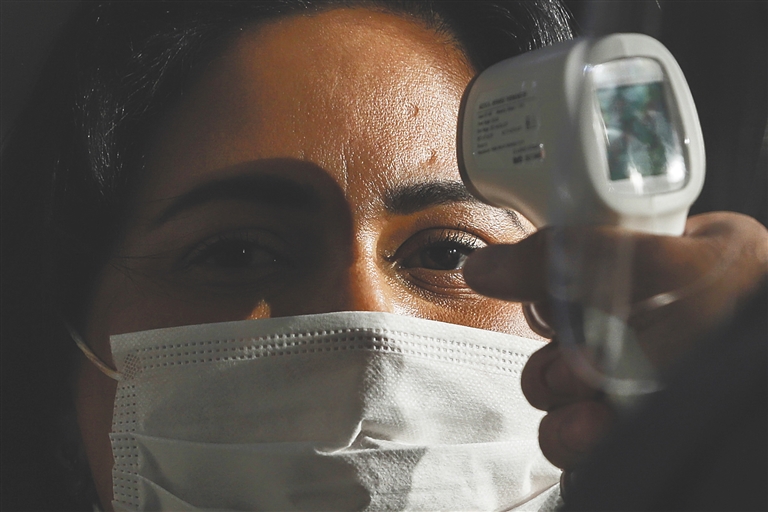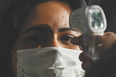 图为11日,巴西圣保罗市一名女子在进入购物中心前接受体温检测。 新华社发(拉赫尔·帕特拉索摄)