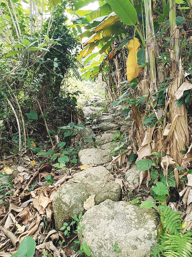 一个踏青的好时节,在万宁市博物馆馆长吴挺光带领下,我们到达礼纪镇旧村,徒步穿越过路岭,寻找一千多年前那条千疮百孔的“万陵古道”。我们踩着崎岖不平的小径,穿过密集的槟榔树林,绕过荆棘丛生的灌木藤葛,不久,看见一条乱石铺就的小道。吴馆长指着乱石路说,这就是万陵古道过路岭西段起点。