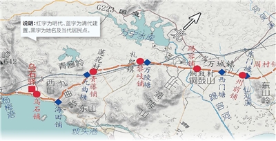 这条万陵古道自分界墟(即乐会与万州分界处)向南靠近沿海平原行走,途经星驰铺(龙滚渡)、多陈铺(合岭)、田头铺、勒赛铺(黎墓村)、莲塘铺、冯吴铺(后疍市西)、周村铺(周家庄村)、州前铺(东山岭北侧官亭)到达万州城。从万州城西门出发,经过白茫村,向南走到达踢容河铺(今太阳河),距万州城5千米处,因河宽水急不能架桥,所以设官渡——踢容河古渡。接着向南走,从镜门岭北面山脚经过,走三四千米到达东澳墟——这里是海鲜等农副产品贸易市场,经商者在这里采购海鲜、布匹、衣服、鞋、帽、刀具等商品,肩挑或用牛马驮着沿万陵古道走,在经过的墟镇和驿站销售,或兑现银宝、鹿茸、猴羔等山货。向西面走经过双灶村,接着翻越延绵百里山脉——过路岭。过路岭原来没有名字,因万陵古道从岭上通过,后人便把此岭命名为“过路岭”。这里现存1100米的石铺古道,但路窄崎岖,树林藤葛茂密,荆棘丛生,行人难走。