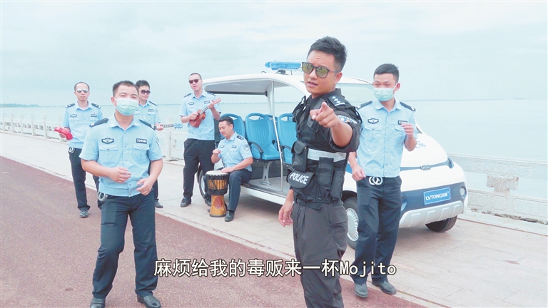 在这首MV中,海南省公安厅禁毒总队二级警长胥瑞“C位出道”,除了担任主唱外,他也是这首改编作品的创作者。