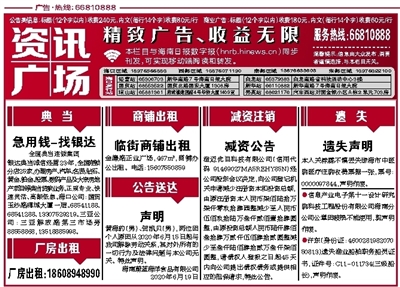 银达典当诚信经营23年,全国连锁分店25家,办理房产、汽车、名表、钻石、黄金、铂金、股票、数码产品及大宗房地产项目等典当贷款业务。正规专业、快速灵活、高额低息。海口公司:国贸玉沙路椰城大厦一层。68541188、68541288、13307529219。三亚公司:三亚解放路第三市场旁 88558868,13518885998。