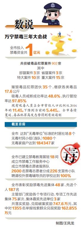 万宁举全市之力,迎难而上,开展禁毒“角力”战。全市投入禁毒资金共1亿元,共侦破毒品犯罪案件902宗,其中部督案件3宗、省督案件3宗、特大案件10宗、重大案件15宗,摧毁毒品犯罪团伙35个,缴获各类毒品17.6公斤。现有吸毒人员占全市常住人口比例从2016年的11.4‰下降到当前的5.44‰,全市毒情形势得到根本性好转。