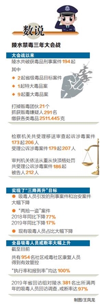 通过深入开展禁毒三年大会战,陵水禁毒工作实现了“三降两升”目标。吸毒人员引发的刑事案件和治安案件大幅下降,特别是“两抢一盗”案件2018年同比下降77%,2019年同比下降17%;现有吸毒人员占比大幅下降。