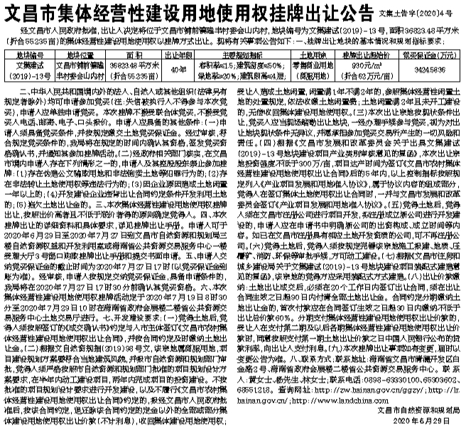 文昌市集体经营性建设用地使用权挂牌出让公告