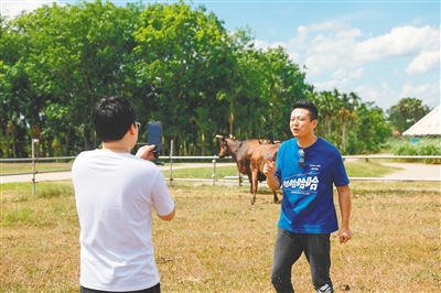 “海垦和牛和海南非遗项目海南粉碰撞会产生什么火花?今天就来会会它们!”6月28日,在位于澄迈县文儒镇的海垦和牛文儒牧场,拥有近270万粉丝的抖音达人“琼斯爱生活”化身“海南好物推荐官”,在牧场开启直播,吸引数十万网友观看及购买。他通过“考察”海垦和牛生长环境,并利用和牛制作美食,与海南粉共同品尝等,带着网友们从田间走入舌尖。