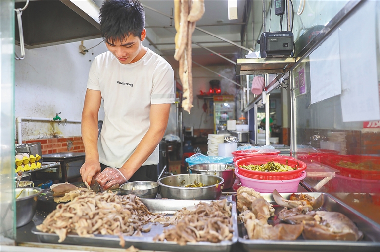 在义龙西路和义龙路交叉口的位置,一家开了近20年的盐焗鸡老店,每逢饭点都座无虚席。“过去这里的老居民很多,我们的生意比现在还好,很多人排队打包。”盐焗鸡店的符老板说,近些年来,越来越多的年轻人走出老街,到外面买房生活,不过好在义龙路的美食名气在外,有不少食客慕名而来,生意还比较好做。