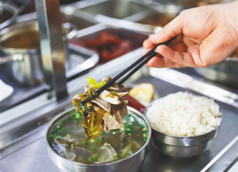 “老板,我要辣汤饭套餐,再加根腊肠。”“我也要一份辣汤饭,多加猪杂和酸菜。”