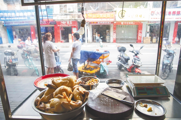 “我们已经在这里做了40多年了,算是干了一辈子了。”小店的玻璃柜子里,展示着还冒着热气的白斩鸡——黄澄澄的鸡皮色泽油亮,勾人食欲。店主兰姨笑容满面,时常和食客闲聊几句。