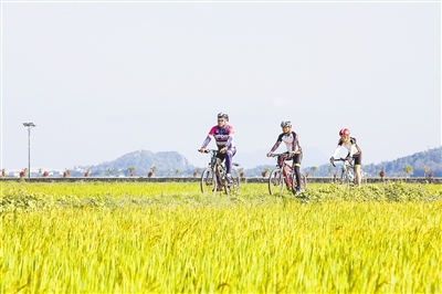 沿着环小海路骑行,一路上三角梅花开竞艳,道路一侧,小海的瓜形海面波光粼粼,鸟飞鱼跃。另一侧是大片大片的金黄稻田,稻香盈满鼻尖,勃勃生机与丰收气息伴随着骑行之旅。