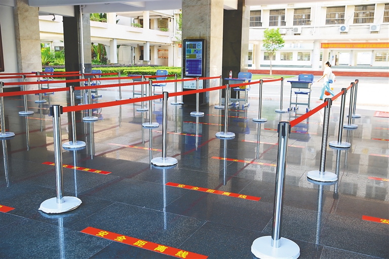 7月5日,在海南中学高中部考点,考场工作人员在精心布置考场,并划设安全距离线。