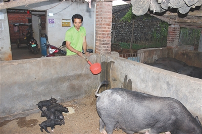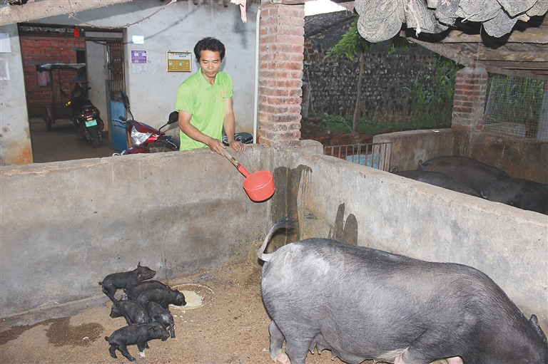 被纳入建档立卡贫困户之后,政府给我送来29头黑猪崽,还派了一名帮扶责任人。在2016年冬天,因为缺乏技术和经验,小猪病死了十几头,我非常自责,也因此下决心要将技术学到位。我常向一些养猪大户请教,跟他们交朋友、学经验,积极参加电视夜校。正巧,那时镇政府扶贫干部和畜牧业技术员送技术到村,给所有贫困户讲解扶贫政策,进行生产技术培训,我学得很认真。