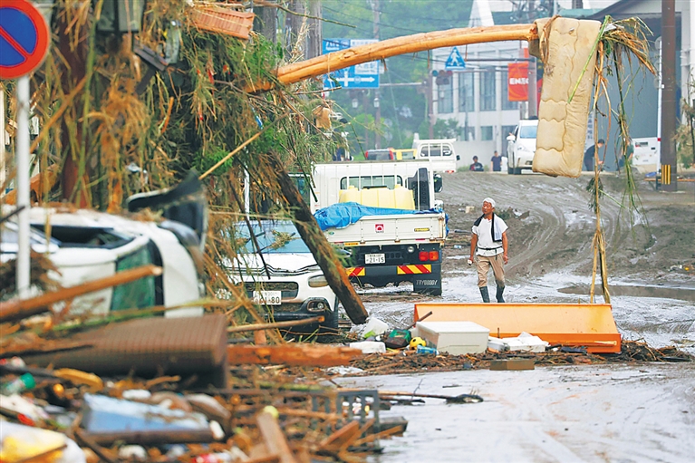 图为一名男子站在日本熊本县人吉市暴雨过后的街道上。 新华社/美联