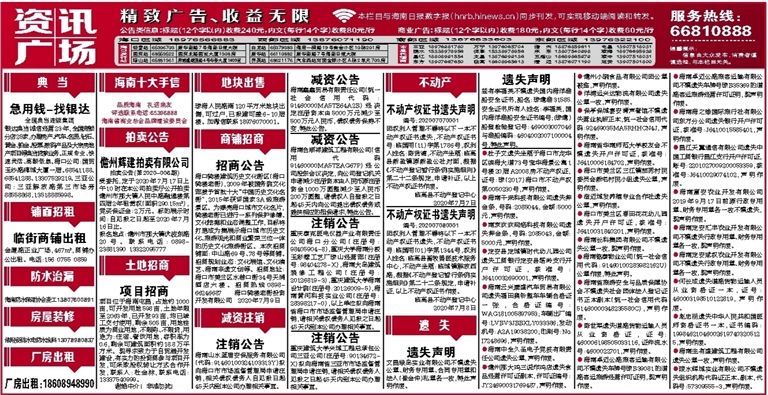 受委托,定于2020年7月17日上午10时在本公司拍卖厅公开拍卖儋州市那大镇人民中路融通楼第四层2年租赁权(面积290.15m2),竞买保证金:2万元。标的展示时间:自见报之日起至2020年7月16日止。