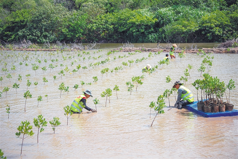 7月8日,在海南东寨港国家级自然保护区湿地生态修复工程项目三江农场附近,工作人员在退塘后整理出来的滩涂上栽种着一株株红树,为东寨港打造新的风景线。本报记者 袁琛 摄