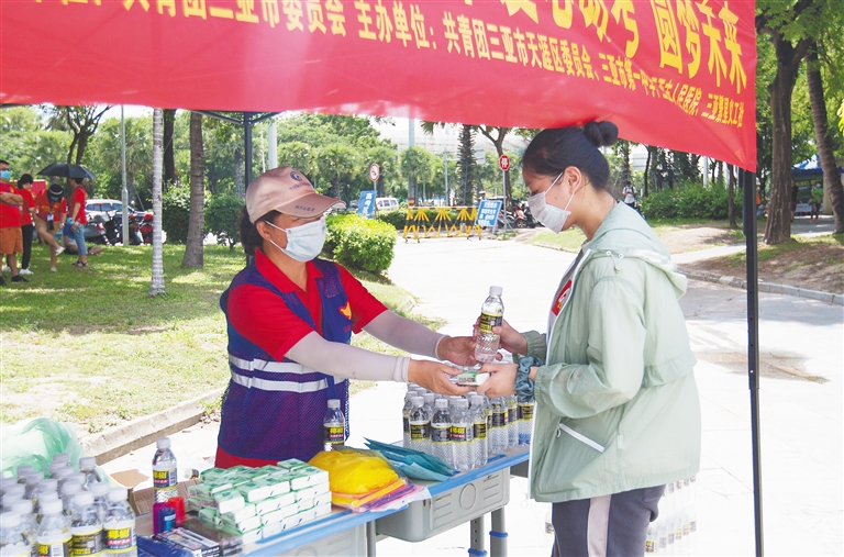 ①7月8日,在三亚第一中学考点门前,志愿者为考生家长提供水和纸巾。本报记者 武威 摄