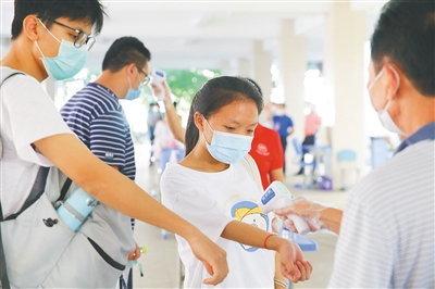③7月7日,在海南中学初中部考点,考生在测量体温。 本报记者 张茂 摄
