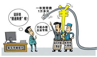 那么,是谁在卡“提速降费”的脖子?报道指出,一些房地产开发企业、商务楼宇物业管理方与网络运营商签订排他性服务协议,形成局部垄断,排挤正当竞争,伤害了消费者的自主选择权。有些商务楼宇物业管理方巧立名目,向企业用户滥收线路维护费、管道占用费、端口费等费用。