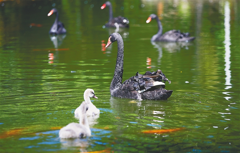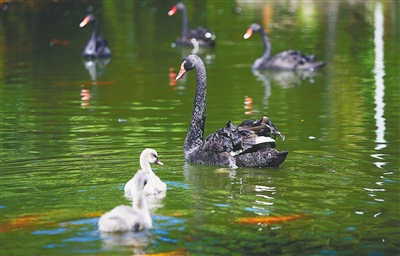 | 黑天鹅幼雏跟随亲鸟群在湖中游行。刚出生的黑天鹅肤色呈浅灰色,6个月左右才可学会飞行。 |