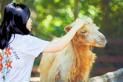 | 游客与小骆驼“惊蛰”的亲密接触。小骆驼诞生于2020年的惊蛰期间,因此得名“惊蛰”。由于骆驼妈妈缺乏带崽经验,出生后不久便弃养小骆驼,但海野的“奶爸”“奶妈”担起了责任,全日无休,精心照料,每隔2小时喂一次奶,让“惊蛰”幸运地存活了下来,并逐渐学会食草,开始健康成长。 |