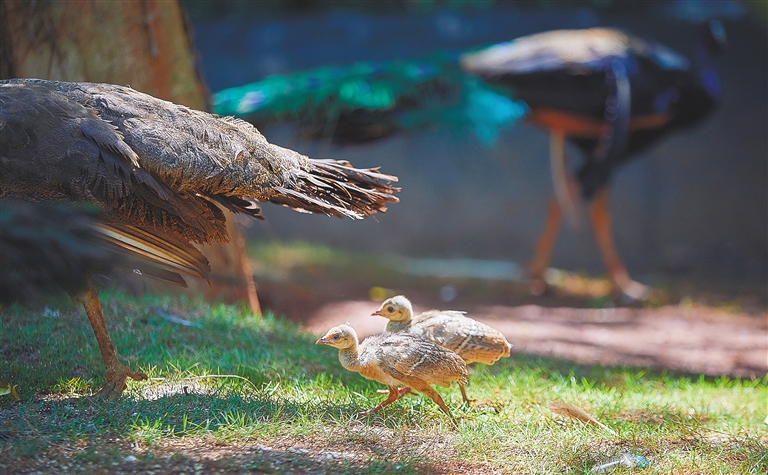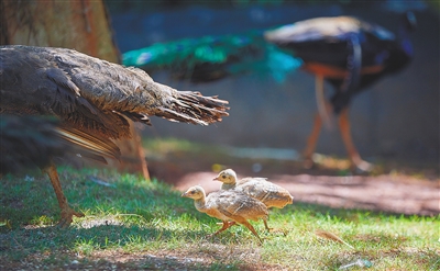 | 两只形似“鸡仔”的蓝孔雀宝宝亦步亦趋地跟在母亲身后。作为飞禽的颜值担当,蓝孔雀以优美的外形和华丽的尾羽所闻名。蓝孔雀别称为印度孔雀,雄鸟拥有直立的枕冠,羽色华丽,尾上的覆羽特别长,远超过尾羽。蓝孔雀的繁殖期为3-6月,喜筑巢于灌木丛中的地面凹坑上。 |