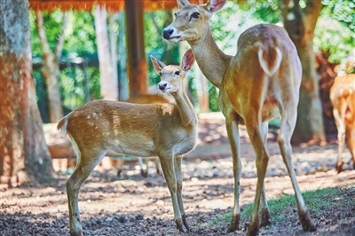 | 小坡鹿认真地跟妈妈学习野外生存课中最重要的“保持警惕”。坡鹿是印度泽鹿的同属,外形与梅花鹿相似,但体型较小,背中线为黑褐色,背脊两侧各有一列白色斑点。作为海南最广为人知的神话传说“鹿回头”中神鹿的原型,坡鹿也被视为海南文化的代表形象之一。 |
