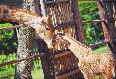 | 长颈鹿宝宝依偎在长颈鹿爸爸身旁。 长颈鹿繁殖孕期15个月,每胎产一仔,生下来的幼仔身高便可达到1.8米左右,出生后20分钟即能站立,数小时后即可奔跑。但在出生后前两周,幼鹿多数时间在地上静卧,并受母鹿的庇护。 |