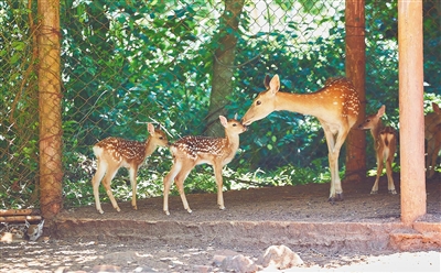 | 麋鹿妈妈和宝宝。麋鹿是中国特产、世界珍稀的动物。其长相奇特,头脸像马、角像鹿、蹄子像牛、尾像驴,所以也被称为“四不像”。麋鹿是一种大型食草动物,原产于中国长江中下游沼泽地带,性好合群,善游泳。根据世界自然保护联盟的濒危物种红色名录,麋鹿的评级为“野外灭绝”。目前,中国已在北京、江苏省盐城大丰区、湖北省石首市、河南省原阳县等地实施麋鹿散养计划,成功恢复一定规模的麋鹿种群。 |