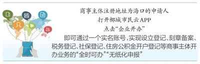 据介绍,椰城市民云上线“企业开办”服务主要实现了一站式办理,方便快捷,随时可办、自动审核,电子化登记、申请材料少,统一入口、无须额外注册,非接触式、疫期办事无忧五大便利。