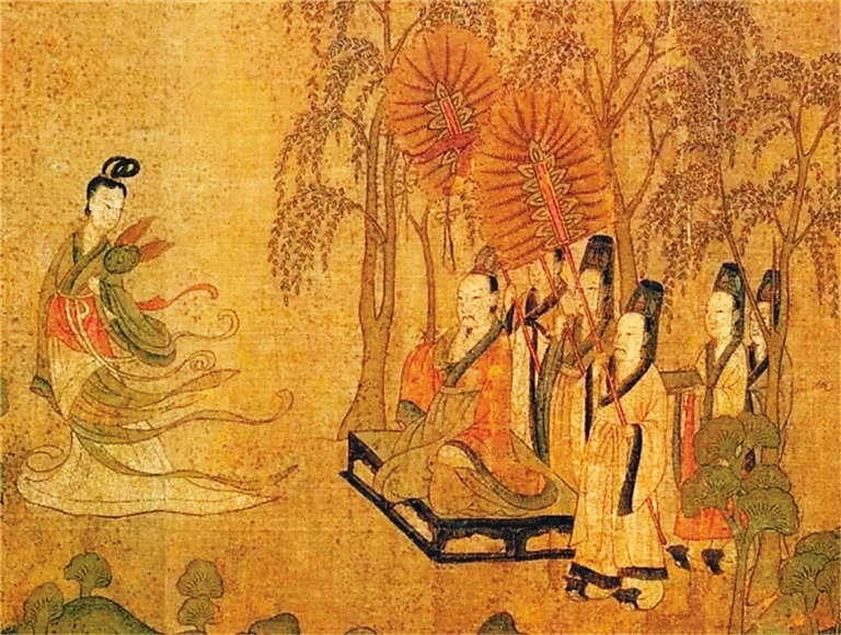 《洛神赋图》以长卷连环画形式展开,画中反复出现曹植与洛神的形象,将《洛神赋》中从相慕到相离的故事巧妙地串联起来,实现了不同时间、空间的变幻。表达了作者不得不“归乎东路”了,但仍“揽辞髻以抗策,怅盘桓而不能去”的情怀。被誉为“中国十大传世名画”之一。