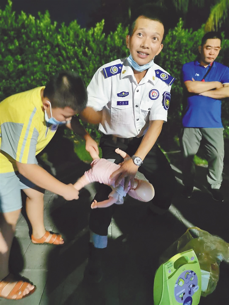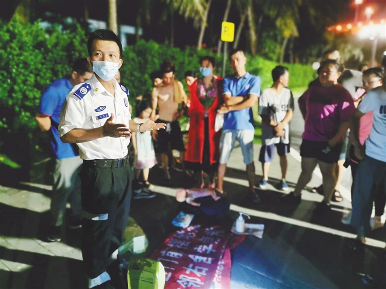夏日的夜晚,不少海口市民喜欢到海口世纪大桥下的海口湾绿道上吹吹海风、遛遛弯。老严发现这块宝地正好可以用来教急救知识。